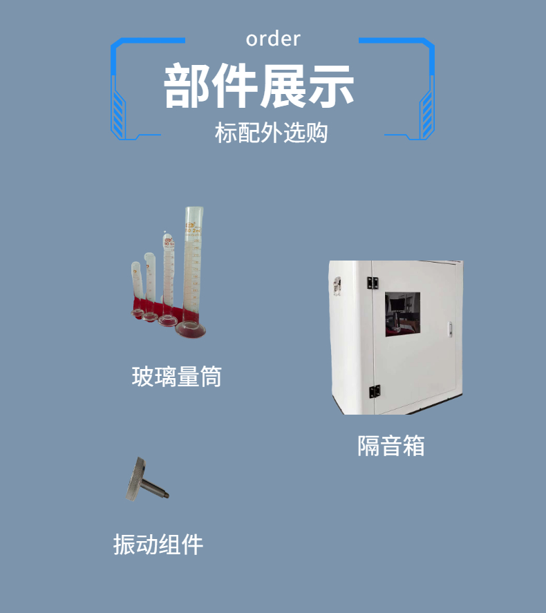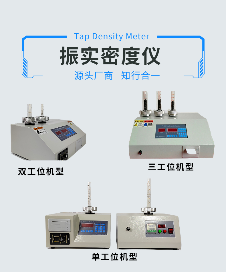 1.振實密度測定儀的工作方式:通過機械震動的方式對裝有粉末樣品的量筒進行固定頻率和振幅的敲擊,直至樣品在量筒中密實而不在下降為止,在通過密度計算公式,質量與體積之比獲得.