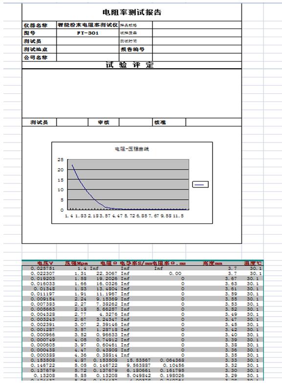 電阻值、電阻率、電導(dǎo)率值、溫度、壓強(qiáng)值、單位自動(dòng)換算、 橫截面積、厚度、曲線圖譜、壓實(shí)密度、生成報(bào)表等. |