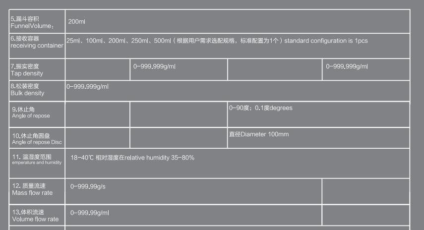 提供中文或英文語言版本選擇,,自動測量控制系統,分析粉末和顆粒物料,采用光電測量系統自動測量數據,數據由集成電路系統處理并分析評定物料的流動性狀態,反映粉體和顆粒的流動能力和密度數據為料倉設計。